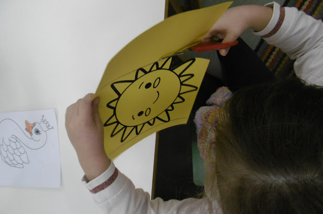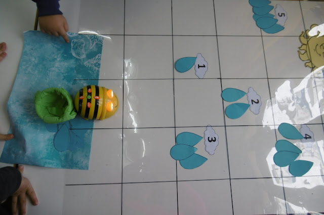 Αρχικά, δημιουργήσαμε έναν χάρτη με σύννεφα και αριθμούς (1-5). Στο κάτω μέρος του χάρτη τοποθετήσαμε μπλε χαρτόνι συμβολίζοντας την θάλασσα. Μέσα σε αυτή ρίξαμε μικρές γαλάζιες σταγόνες . Ο ήλιος έδινε εντολή στην μελισσούλα να μεταφέρει σταγόνες στα σύννεφα! Το παιδί έπαιρνε από τη «Θάλασσα» του χάρτη, τόσες σταγόνες όσες του έλεγε ο ήλιος και προγραμμάτιζε την διαδρομή για να φτάσει και να αφήσει στο σωστό σύννεφο τις σταγόνες !